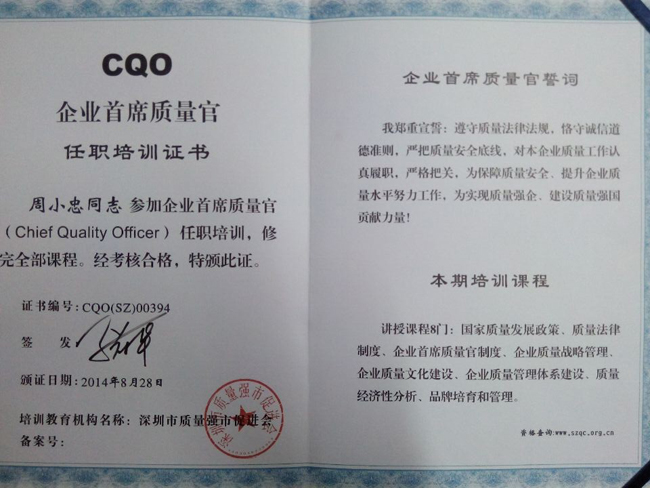 九月是全國質(zhì)量月,在深圳市副市長(zhǎng)陳彪的指示下,深圳開展了一系列的質(zhì)量月活動(dòng),其中作為活動(dòng)之一的“首席質(zhì)量官CQO培訓(xùn)考試”工作已經(jīng)告一段落。近日在寶安區(qū)市場(chǎng)監(jiān)督管理局舉行頒發(fā)CQO證書大會(huì),我公司質(zhì)量部周經(jīng)理喜獲考核通過,獲得了首席質(zhì)量官證書,應(yīng)邀參加了此次頒發(fā)證書活動(dòng)。