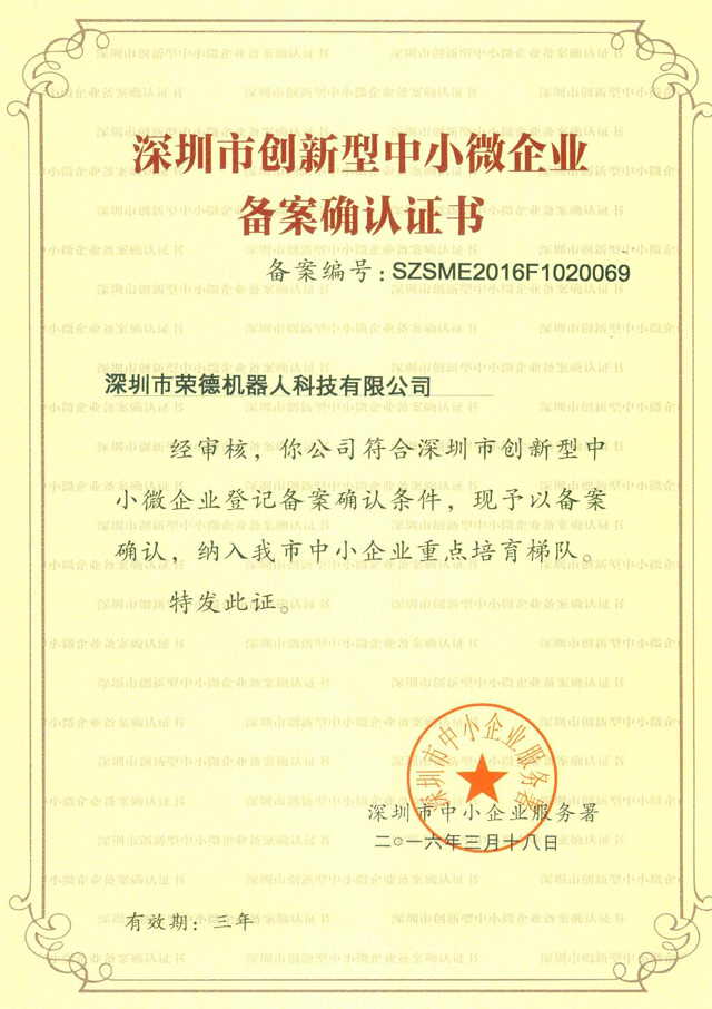 深圳市榮德機(jī)器人科技有限公司在2015年11月份提交了申請材料,經(jīng)過三個(gè)月的嚴(yán)格審核,終于在2016年3月18日獲得了創(chuàng)新型中小微企業(yè)證書。