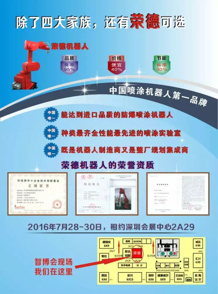 雖然在南海問題愈演愈烈的當(dāng)下,支持民族品牌已是大勢所趨,但榮德機(jī)器人不打感情牌,我們打技術(shù)牌、實力牌,如果您有興趣參觀過榮德的展位2A29,也許您會發(fā)現(xiàn):除了四大家族,榮德噴涂機(jī)器人也是一個非常不錯的選擇!多謝指教!