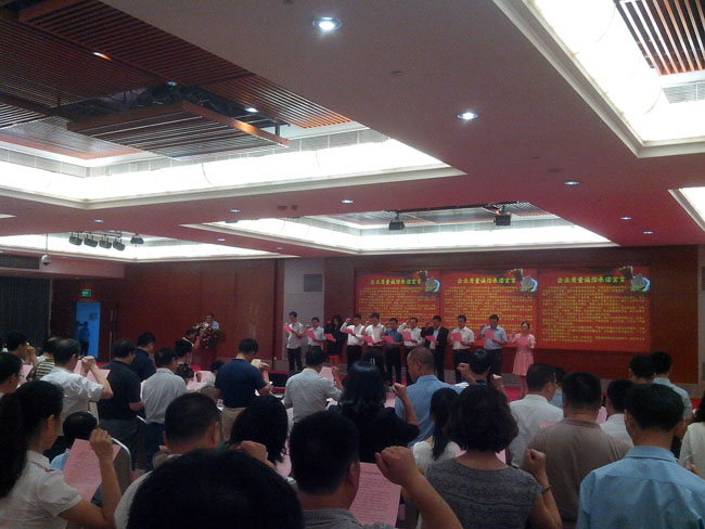 大會的高潮部分是所有與會的企業(yè)代表與政界代表一起舉起右手,宣讀《企業(yè)質(zhì)量誠信承諾書》:為構(gòu)建誠信經(jīng)營、公平競爭的市場環(huán)境,加強質(zhì)量誠信體系建設(shè),切實保證產(chǎn)品質(zhì)量,維護消費者的合法權(quán)益,推動建設(shè)“質(zhì)量強國”,促進“質(zhì)量強市”、“質(zhì)量惠民”。本企業(yè)向社會鄭重承諾:一、牢固樹立“質(zhì)量第一”的思想,不斷增強質(zhì)量意識和社會責(zé)任意識,保證和提高產(chǎn)品質(zhì)量,落實企業(yè)質(zhì)量主體責(zé)任,滿足人們?nèi)罕妼Ω哔|(zhì)量產(chǎn)品的期待和需求,增強人民群眾的消費信心。二、嚴(yán)格遵守《產(chǎn)品質(zhì)量法》、《標(biāo)準(zhǔn)化法》、《計量法》等法律法規(guī),嚴(yán)格執(zhí)行產(chǎn)品標(biāo)準(zhǔn),不制假、不售假,杜絕虛假宣傳,堅決抵制假冒偽劣、欺詐消費者等失信違法行為,不侵害其他企業(yè)合法權(quán)益。三、加強全員、全過程、全方位的質(zhì)量管理,推行先進質(zhì)量管理方法,完善計量保證體系、標(biāo)準(zhǔn)化體系和質(zhì)量保證體系,嚴(yán)格原材料,生產(chǎn)過程、產(chǎn)品出廠和儲運銷售全過程的照顧質(zhì)量控制。四、建立質(zhì)量安全事故主動報告制度,嚴(yán)格落實質(zhì)量安全責(zé)任追究制度,完善產(chǎn)品質(zhì)量追溯體系,及時解決消費者的質(zhì)量投訴,自覺履行產(chǎn)品質(zhì)量召回、“三包”等產(chǎn)品質(zhì)量責(zé)任和義務(wù)。本單位嚴(yán)格履行以上承諾。如有違反,愿意承擔(dān)相應(yīng)的法律責(zé)任,接受將失信違法行為納入不良信用記錄并向社會公開。二0一四年九月五日